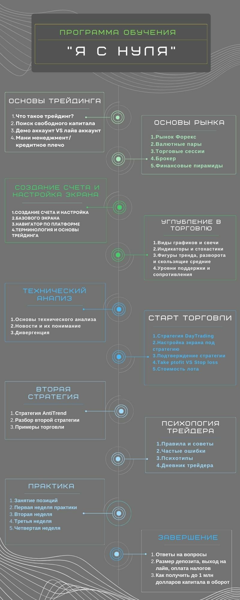 После прохождения всех модулей по обучающей программе и получения зачетов, начинается время практики. Вы будете присылать каждый понедельник и четверг свои позиции и Алиса будет разбирать каждую вашу позицию, указывая на ошибки. Практика длится 4 недели и происходит на демо счете ( реальные движения рынка, но без ваших реальных вложений) поэтому вложений делать не нужно.